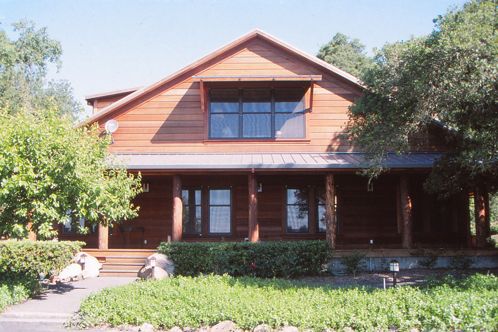 This is a complete makeover of an existing ranch house and now consists of a single, simple gable roof with dormers on the east and west sides to afford light and view to a full length loft-library. The majority of the heavy framing is comprised of Douglas fir tree trunks with exposed bolted connections. The fireplace stone was excavated from the hillsides surrounding the vineyard. The exterior glass is shaded with a combination of existing oak trees, exterior sun shades, and a wrap-around covered porch. Traditional shiplap siding, redwood peeler poles, and gray metal roofing are used to ease the visual impact on the landscape.