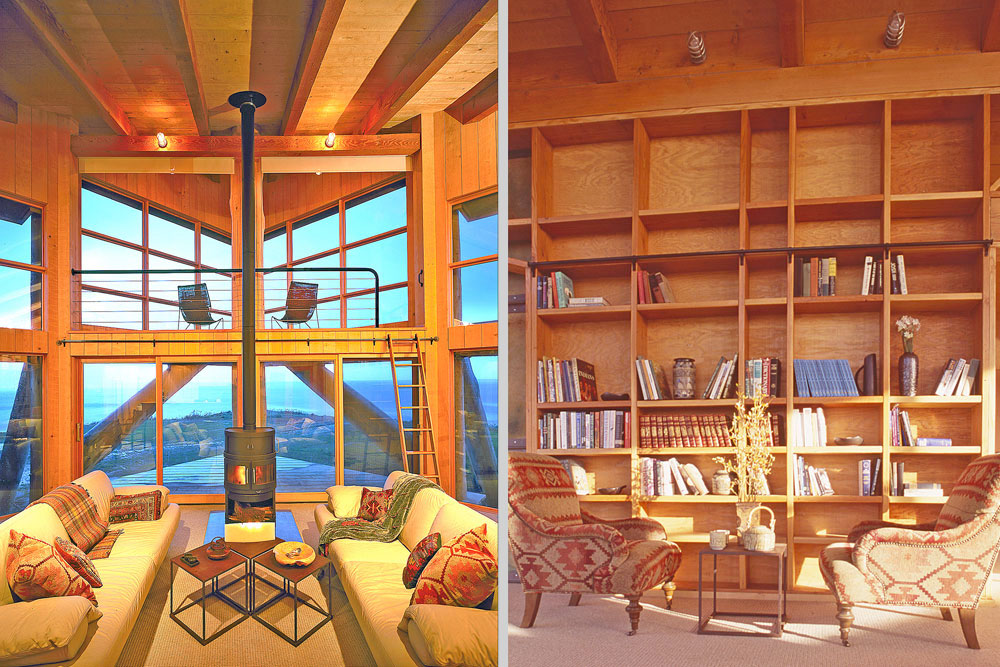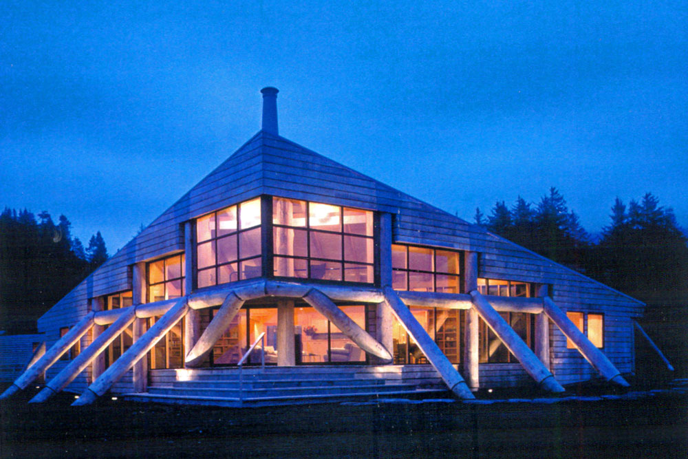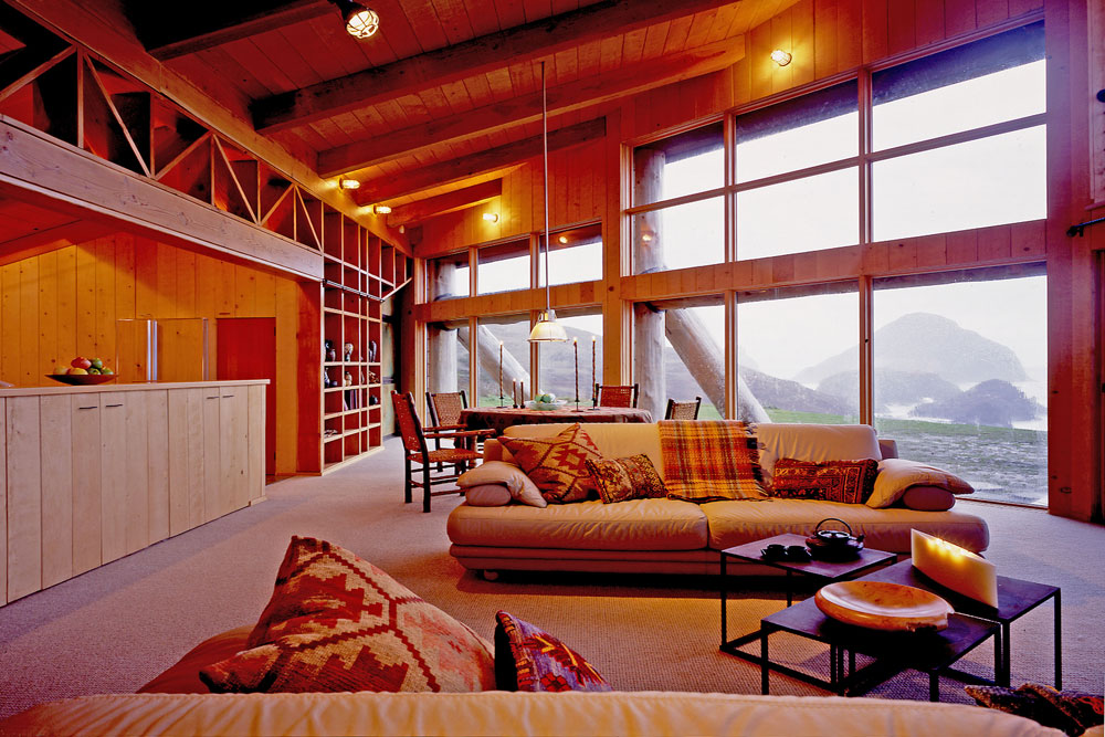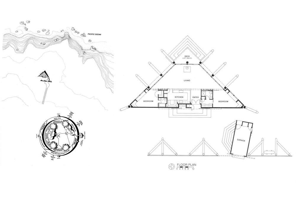 This 1860 SF vacation house on the Gold Beach, Oregon coast can experience wind speeds of up to 90 mph. The triangular structure points its prow-like nose out to sea and grabs ahold of its site with an exoskeleton of Port Orford cedar logs, inspired by the driftwood logs and debris found along the rocky shoreline. These buttresses resist all lateral loads and negate the need for view blocking shear walls.