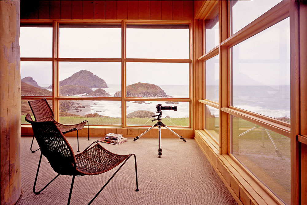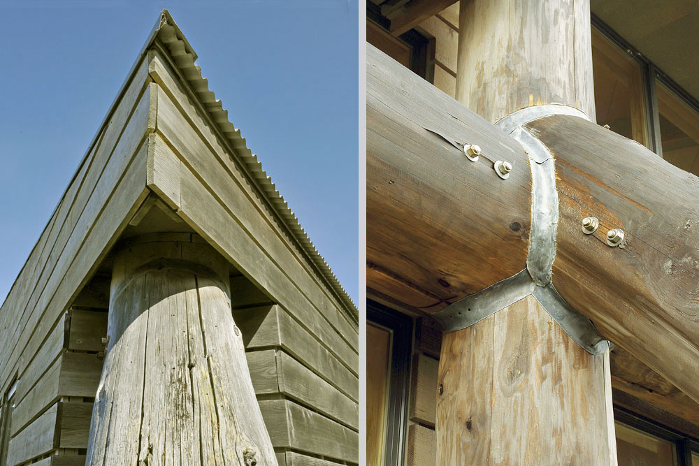 Cantilevered out towards the ocean is an elevated loft accessed via the portable ladder. Excessive heat gain is controlled with tinted recessed glazing, interior shades, and a passive ventilation chimney located at the apex of the loft. The glazing walls are connected to the exoskeleton with threaded pipe unions that can be expanded (by unscrewing) to keep the walls plumb as the logs shrink over time.