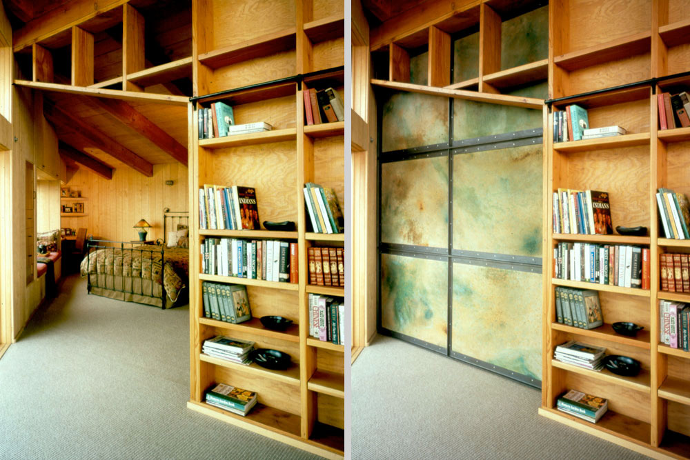 The hypotenuse of the triangular living area is constructed of exposed 2x framing serving as a library wall complete with industrial lighting and a portable rolling ladder. Large sliding wall panels allow the bedrooms to open up to the living area for spatial expansion as well as increased ocean views. The panels are generic cement board stained with common garden fertilizers and set in structural steel frames sealed with melted bees wax.